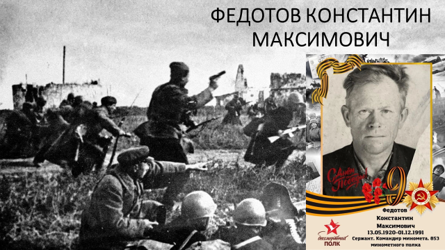 | ПОМНИМ, ГОРДИМСЯ, ЧТИМ О своих героических предках рассказывают сотрудники военного суда. Перед Великой Отечественной войной население Чебаркуля составляло всего 8000 человек. Более 2000 километров отделяли его от линии фронтов. Но наши предки, как и весь советский народ, отдали все для Победы. Около 4,5 тысяч чебаркульцев отправились сражаться с фашистами. Бережно хранит память, фотографии и боевые награды своего деда Светлана Евгеньевна Самохина. Из приказа командира 847 Артиллерийского полка: От имени Верховного Совета СССР награждаю медалью «За боевые заслуги» командира отделения взвода боепитания управления 2 дивизиона сержанта Федотова Константина Максимовича за то, что он, выполняя боевое задание, совершив 1000-километровый марш в трудных условиях, горной, пустынно-безводной местности, сохранил в отличном состоянии личный состав, оружие, проявив образец выносливости и трудолюбивого отношения к делу. Героически сражался с врагом совсем еще юный 15-летний боец Красной Армии Кузьминых Борис Михайлович, который от полученных в боях ран длительное время лечился в госпиталях и умер от болезни в 1946 году. Но память о нем живет в семье Журавлевой Екатерины Михайловны, как и о ее бабушке Шустовой Клавдии Константиновне, которая после получения медицинского образования в составе боевых подразделений Красной армии дошла до Берлина, спасая сотни жизней защитников Отечества, проявляя на поле боя образец мужества и героизма. Личный вклад Клавдии Константиновны в Великую Победу отмечен высокой государственной наградой – Орденом Отечественной войны 2 степени. Артиллерист Репников Павел Михайлович свой боевой путь начал с битвы за Сталинград, освобождал от нацистских захватчиков Луганскую, Донецкую области и Крым, принимал участие в операциях по освобождению Белоруссии и Польши, а День Победы встретил в боях, продолжая в составе 281 артиллерийского зенитного полка разгром гитлеровцев в Чехословакии и Австрии. За годы Великой Отечественной войны красноармеец Репников награжден медалями «За оборону Сталинграда», «За отвагу», «За Победу над Германией», «За взятие Вены». В его честь был назван внук Репников Павел Владимирович, который гордится своими предками, совершавшими не только ратные, но и трудовые подвиги. Так в годы войны, в кратчайшие сроки был построен Чебаркульский металлургический завод, на котором героически трудились Бибикины Николай Михайлович и Нина Федоровна В трудовой книжке Николая Михайловича, за номером четыре, записано: - 14 марта 1942 года принят в цех № 2, Государственного завода № 701, строгальщиком, - а с сентября 1944 года он становиться помощником кузнеца, и в этой должности встречает долгожданную Победу. За добросовестный труд Николай Михайлович будет награжден медалью «За трудовое отличие, станет кавалером ордена Октябрьской Революции. Видеоролик доступен по ссылке: https://vk.com/video-217899922_456239036 Пресс-служба Магнитогорского гарнизонного военного суда