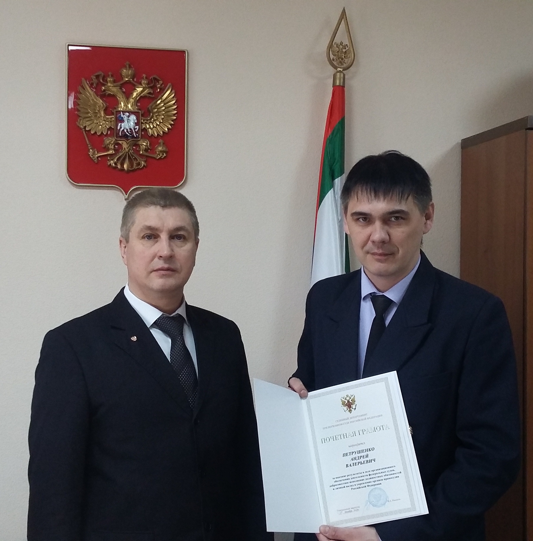 Петрушенко Андрей Валерьевич, администратор Магнитогорского гарнизонного военного суда, награжден Почетной грамотой Судебного департамента при Верховном Суде Российской Федерации за высокие результаты в деле организационного обеспечения деятельности федеральных судов общей юрисдикции, добросовестное исполнение должностных обязанностей и личный вклад в укрепление органов правосудия. Почетную грамоту Андрею Валерьевичу в торжественной обстановке вручил временно исполняющий должность председателя военного суда Усачев Евгений Владимирович. Поздравляем с высокой наградой и желаем дальнейших профессиональных успехов. Коллектив Магнитогорского гарнизонного военного суда![]() |